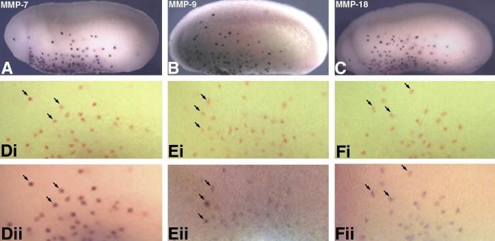 Fig. 1. Whole-mount in situ hybridisations of Xenopus embryos showing specific expression patterns of the MMPs-7, -9 and -18 in migrating macrophages (stage 24). Representative examples of the 10 embryos assayed. (A) MMP-7, (B) MMP-9 and (C) MMP-18. (DâF) Double whole-mount in situ hybridisation with POX2 (Di, Ei, Fi) developed with fast red and MMP-7 (Dii), MMP-9 (Eii) and MMP-18 (Fii) developed with NBT/BCIP. Arrows indicate single macrophages stained for both POX2 and an MMP. All embryos are shown in lateral view, with anterior to the left.