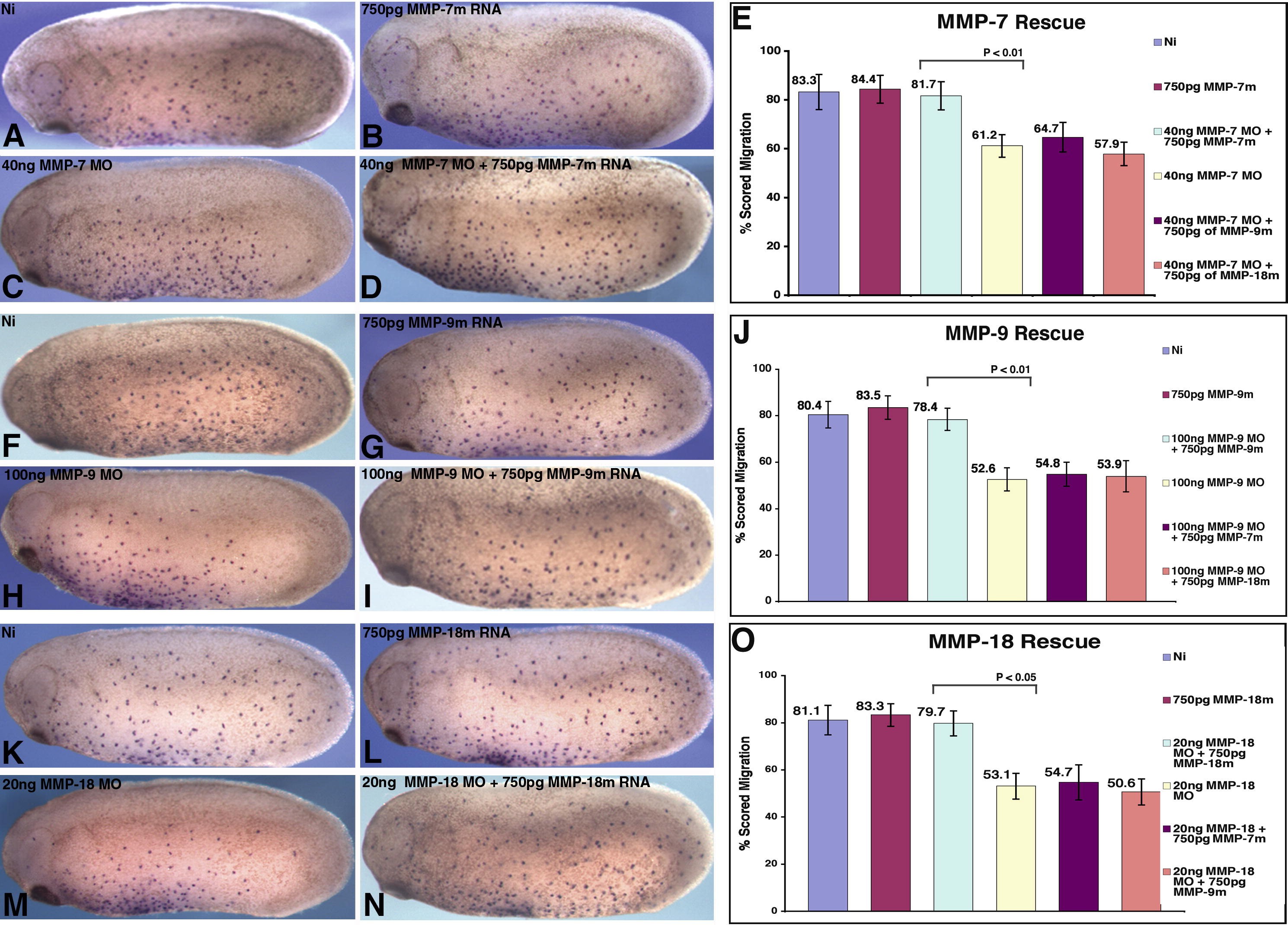 Fig. 3. Rescue of normal macrophage migration using an MMP morpholino and the co-injection of mutated RNA. (AâE) MMP-7 rescue experiments. (A) Non-injected control embryo (Ni). (B) Embryos injected with 750Â pg of mutated MMP-7m RNA. (C) MMP-7 morpholino injected at 40Â ng in the DMZ. (D) Co-injection of 750Â pg of MMP-7m RNA and 40Â ng of MMP-7 morpholino restores normal migration. (E) Quantification of results from AâD plus co-injection of 750Â pg of MMP-9 or 18 RNA with 40Â ng MMP-7 morpholino fails to rescue normal migration. (FâJ) MMP-9 rescue experiments. (F) Non-injected control embryo (Ni). (G) Embryos injected with 750Â pg of mutated MMP-9m RNA. (H) MMP-9 morpholino injected at 100Â ng in the DMZ. (I) Co-injection of 750Â pg of MMP-9m RNA and 100Â ng of MMP-9 morpholino restores normal migration. (J) Quantification of results from FâI plus co-injection of 750Â pg of MMP-7 or 18 RNA with 100Â ng MMP-9 morpholino fails to rescue normal migration. (KâO) MMP-18 rescue experiments. (K) Non-injected control embryo (Ni). (L) MMP-18m RNA. (M) MMP-18 morpholino 20Â ng. (N) Co-injection of 750Â pg of MMP-18m RNA and 20Â ng of MMP-18 morpholino restores macrophage migration. (O) Quantification of results from KâN plus co-injection of 750Â pg of 7 or 9 RNA with 20Â ng MMP-18 morpholino fails to rescue normal migration. All embryos are stage 26 and are shown in lateral view, with anterior to the left. All macrophages were visualised by in situ hybridisation with POX2. Significant difference from the morpholino injected embryos and the co-injected rescue embryos (asterisks indicate values compared) using a Studentâs t-test were found for MMP-7 (PÂ <Â 0.001), MMP-9 (PÂ <Â 0.001) and MMP-18 (PÂ <Â 0.05).
