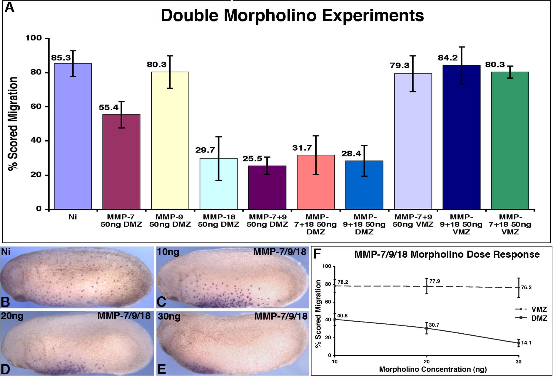 Fig. 4. Multiple loss-of-function experiments demonstrate that the MMPs are acting combinatorily to promote macrophage migration. (A) Bar chart showing result of double morpholino injection loss-of-function experiments. (BâF) Triple loss-of-function experiments. (B) Non-injected embryo (Ni). (C) All three morpholinos injected into the DMZ at 10Â ng each. (D) All three morpholinos injected into the DMZ at 20Â ng. (E) All three morpholinos injected into the DMZ at 30Â ng, showing a complete block on migration. (F) Graph illustrates the control VMZ injections and the DMZ injections, acting in a dose-dependent manner. All embryos are stage 26 and are shown in lateral view, with anterior to the left. All macrophages were visualised by in situ hybridisation with POX2.