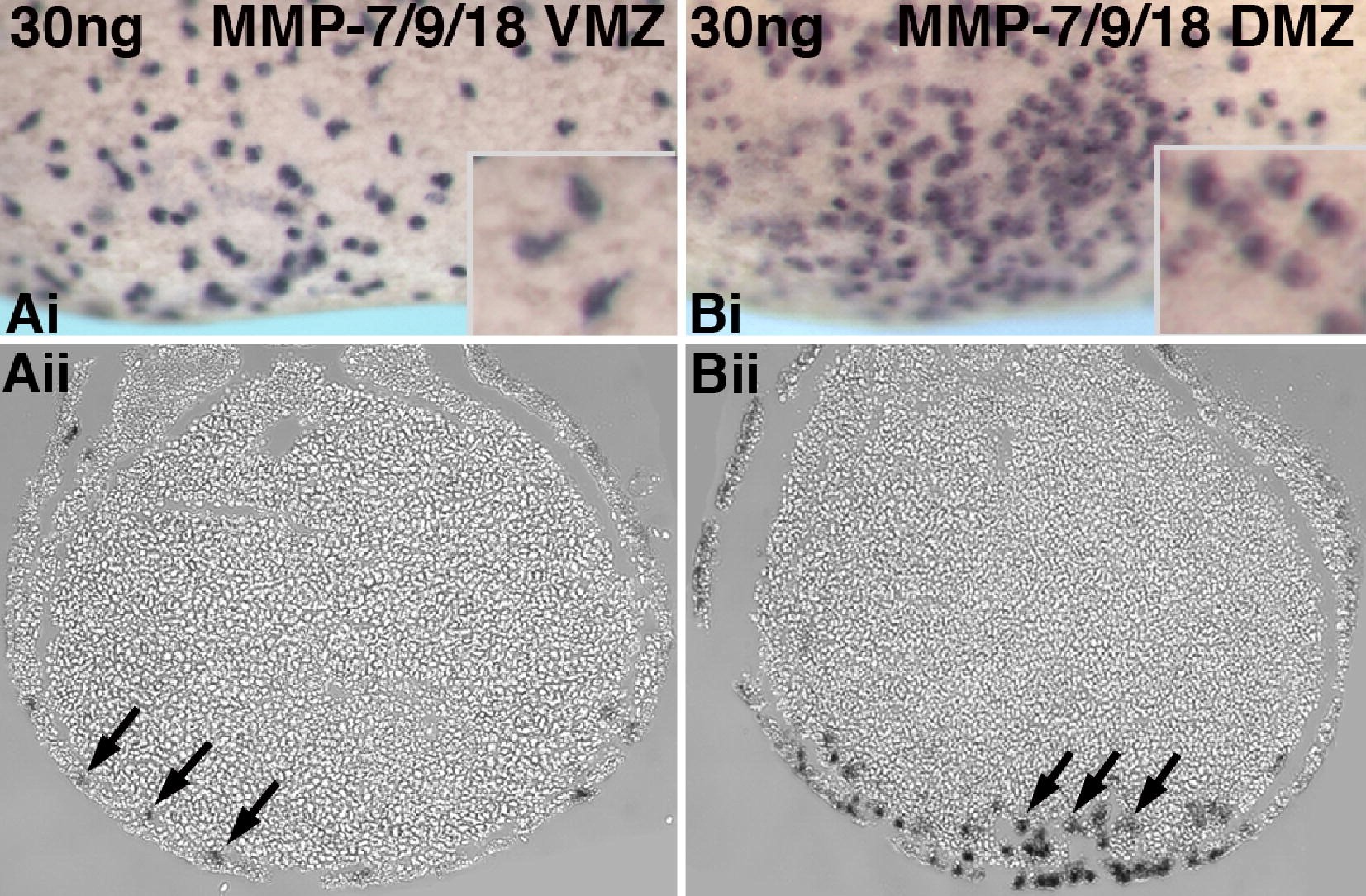 Fig. 5. Macrophage localisation and morphology. In the triple loss-of-function embryos the macrophages are rounded in shape and stay in the mesenchyme and between the epidermis and mesenchyme. (A) 30Â ng MMP-7/9/18 injected into the VMZ. (B) 30Â ng MMP-7/9/18 morpholino injections into the DMZ. Ai and Bi show in situ hybridisation of macrophages with POX2 as a probe, viewing the ventrallateral side of the embryo. Insert boxes show close ups of the macrophages. Aii and Bii show transverse sections of the embryos. Arrows point to individual macrophages.