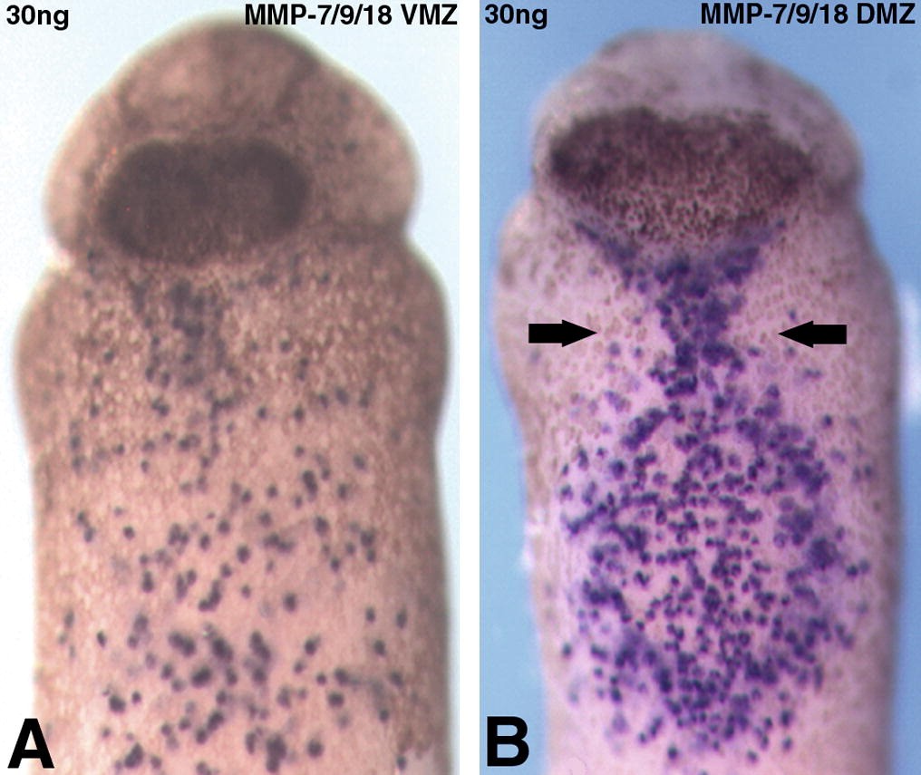 Fig. 6. Knockdown of the three MMPs does not block macrophage migration through the presumptive heart field. In triple loss-of-function assays (30Â ng MMP-7/9/18) a distinct group of macrophages migrates through the presumptive cardiac field (7/10 embryos). Whereas the remaining macrophages are constrained from their normal radial migration route. (A) 30Â ng MMP-7/9/18 into the VMZ. (B) 30Â ng MMP-7/9/18 morpholino injections into the DMZ. The arrows mark the location of the migrating heart fields at this stage of development. The embryos are viewed from the ventral side with anterior to the top. All macrophages were visualised by in situ hybridisation with POX2.