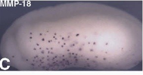 mmp1 (matrix metallopeptidase 1) gene expression in Xenopus laevis embryo via in situ hybridization, NF stage 24, lateral view, anteriorleft.