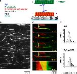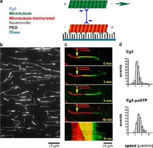 Figure 1. Microtubule pair sliding driven by purified Eg5 in buffer. (a) Schematic of Eg5 within a pair of antiparallel microtubules. The red microtubule is biotinylated and immobilized to a chemically functionalized glass surface via biotin–neutravidin links. The green microtubule is not biotinylated and mobile. (b) Fluorescence microscopy images of Alexa 568 microtubule pairs formed with Eg5-paGFP. Dimly labeled microtubules immobilized on a biotin-PEG glass surface supporting Eg5-mediated binding of brightly labeled microtubules (see Materials and methods). (c) Time series of confocal fluorescence microscopy images of a Cy5-labeled microtubule (green) moved by Eg5 along an immobilized Alexa 568–labeled microtubule (red). Arrows indicate the initial position of the Cy5-labeled microtubule. The bottom panel shows a kymograph of a line along the microtubule pair during the first 5 min of the time series. (d) Histograms showing distributions for speeds of microtubule sliding driven by Eg5 and Eg5-paGFP.