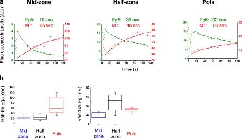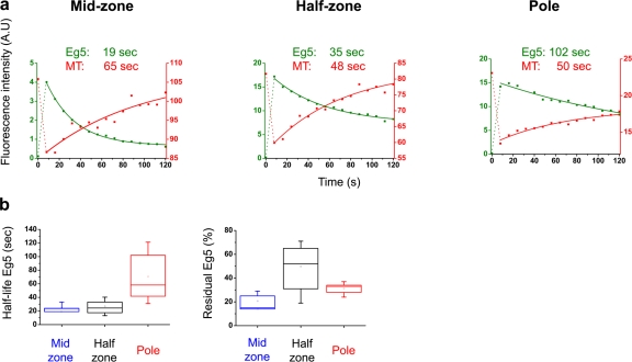 Figure 4. Turnover of Eg5 and microtubules in egg extract spindles measured by time-lapse fluorescence microscopy after photoactivation and photobleaching. (a) Fluorescence decay of photoactivated Eg5-paGFP (green) and fluorescence recovery of Cy5 microtubules (red) in the midzone, the halfzone, and the pole region within the first 2 min after photoactivation and photobleaching. A monoexponential fit (lines) to the experimental values (dots) yielded half-lives as indicated. (b) Box plots of half-lives and residuals of fluorescence decays of photoactivated Eg5-paGFP in the three different spindle regions. 4–12 measurements were made per region.