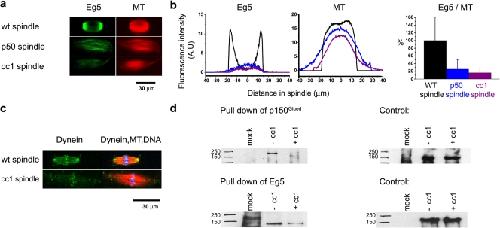 Figure 5. Disruption of the dynein–dynactin complex decreases the amount of Eg5 localizing to spindles in X. laevis egg extract. (a) Confocal fluorescence microscopy images of nonfixed spindles assembled either in the absence or additional presence of p50 or cc1 showing the localization of Eg5. The fluorescence of Eg5-paGFP (green) and of Cy5 microtubules (MT; red) was measured immediately after photoactivation of Eg5-paGFP in the entire spindle. (b) Fluorescence intensity profiles for photoactivated Eg5-paGFP and Cy5 microtubules along the spindle axis for the spindles shown in section a. (right) Mean ratios of the total fluorescence intensity of photoactivated Eg5-paGFP divided by the total fluorescence intensity of Cy5 microtubules (MT) for wild-type spindles, p50 spindles, and cc1 spindles are shown. The means were determined from five spindles per condition. The wild-type intensity ratio was set to 100. Error bars indicate standard deviation. (c) Confocal fluorescence microscopy images of fixed spindles assembled either in the absence (top) or presence (bottom) of cc1 showing the localization of dynein. Dynein heavy chain was detected by immunofluorescence (green), tubulin by using incorporated Alexa 568–tubulin (red), and DNA by Hoechst staining (blue). (d) Western blot analysis showing pull-down of p150Glued with Eg5 on anti-Eg5 beads and pull-down of Eg5 with p150Glued on anti-p150Glued beads in X. laevis egg extract, either in the absence (−cc1) or presence (+cc1) of added p150 fragment cc1. Mock represents magnetic beads coated with an irrelevant antibody also incubated in X. laevis egg extract. An anti-p150Glued antibody was used for detection in the top left three lanes and in the bottom right three lanes, whereas an anti-Eg5 antibody was used for detection in the top right three lanes and in the bottom left three lanes. All samples in a horizontal row were run on the same SDS gel. Molecular weight markers to the left of the blots are in kD.