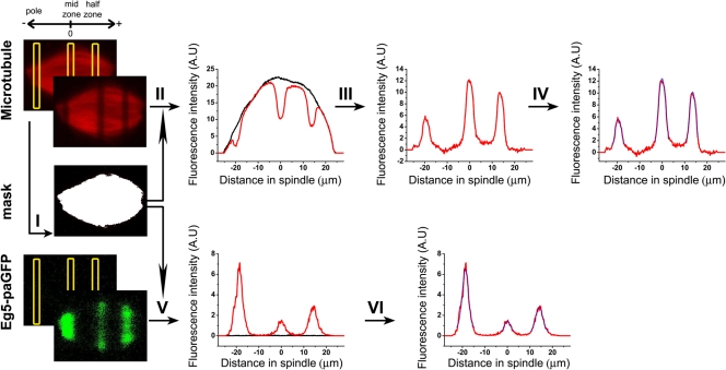 Figure 2. Fluorescence intensity profiles from spindles after photobleaching and photoactivation. Time-lapse videos of a confocal section through spindles containing Cy5 microtubules and photoactivatable Eg5-paGFP were recorded simultaneously in the Cy5 and GFP channel of a confocal fluorescence microscope. Between the first and the second image of a time series, one or several rectangular stripes in the confocal section were bleached and simultaneously photoactivated. To convert the images of the two time series into fluorescence intensity profiles, the area of the spindle in the Cy5 microtubule image before the photobleach was determined by applying an intensity threshold to the image (I). This area served then as a mask for the entire time series of the Cy5 microtubule images and the Eg5-paGFP (illustrated here only for the second frame of the time series). The intensity values were projected onto the spindle axis. This created fluorescence intensity profiles (II and V). The turnover of microtubules and of Eg5 was extracted from time series of these intensity profiles (II and V; see Materials and methods). To determine the exact position of the maximum amount of bleached microtubules, the Cy5 intensity profiles were subtracted from the prebleach profile, resulting in an inverted intensity difference profile (III). The positions of the maximum of the intensity difference profiles of Cy5 microtubules and of the intensity profiles of photoactivated Eg5-paGFP were determined from a Gaussian fit (blue) to the profiles (IV and VI) and used to calculate the velocity of the movements of the peaks (see Materials and methods).