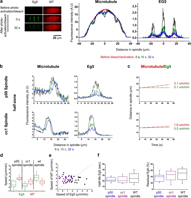 Figure 6. Dynamics of Eg5 and microtubules in spindles assembled after disruption of the dynein–dynactin complex. (a) Spindle assembled in the presence of p50. Confocal fluorescence microscopy images of photoactivated Eg5-paGFP (green) and Cy5-labeled microtubules (red) before and after photoactivation and simultaneous photobleaching in three different spindle regions. Fluorescence intensity profiles for Eg5-paGFP and Cy5 microtubules (MT) of the same spindle at the indicated times. (b) Sections of intensity difference profiles for bleached Cy5 microtubules and intensity profiles for photoactivated Eg5-paGFP in the halfzone of spindles assembled in the presence of p50 or cc1. (c) Displacements of the peaks of photoactivated Eg5-paGFP (green) and of photobleached Cy5 microtubules (red) along the spindle axis with time. Linear regression fits (lines) to the experimental values (dots) yielded the velocities as indicated. (d) Box plots of the speeds of Eg5 and of microtubule flux (MT) in the halfzone of p50 spindles (11 measurements in 6 spindles) and cc1 spindles (20 measurements in 11 spindles) as compared with wild-type spindles (data from Fig. 3 d). (e) Scatter diagram of speeds of directed movements of photoactivated Eg5-paGFP in the halfzone of p50 spindles (blue), cc1 spindles (green), and in unperturbed spindles (black) as a function of the simultaneously measured speeds of microtubule (MT) flux. (f) Box plots of the half-lives of the fluorescence decays of photoactivated Eg5-paGFP in p50 spindles, cc1 spindles, and unperturbed spindles (data from Fig. 4 b) and box plots of the corresponding residuals. Shown are the same measurements as in section e.
