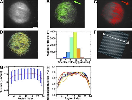 Figure 1. Regional variation of poleward microtubule flux in control Xenopus egg extract spindles. (A) X-rhodamine tubulin speckles. (B and C) Speckle trajectories separated by direction of poleward movement. Green and red arrows indicate flux towards the left and right poles, respectively. (D and E) Speckle trajectories color coded according to the velocity histogram (E); the flux rate of the spindle shown is mean ± SD = 2.52 ± 0.65 μm/min (N = 9,562 trajectories). (F) Definition of 23 regions along the pole-to-pole axis. (G) Mean and SD (error bars) of speckle velocities within regions in F. (H) Spatial distributions of normalized speckle velocities of 11 control spindles. Bar, 10 μm.