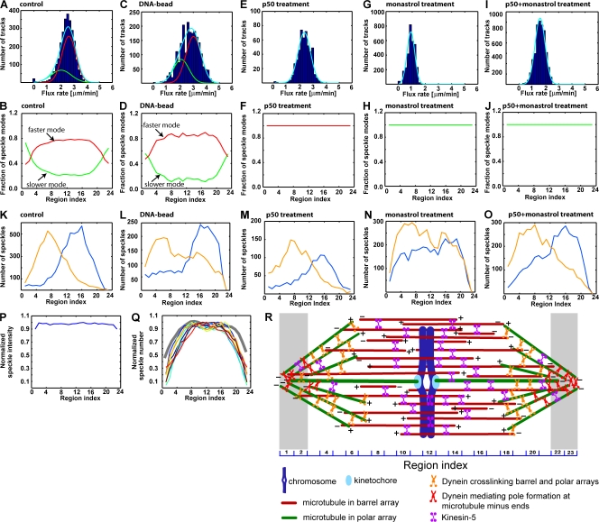 Figure 4. Spatial organization of spindle microtubules. (A, C, E, G, and I) Mode analysis of flux velocity distributions for representative individual spindles: the control spindle in Fig. 1 A (A), the DNA bead spindle in Fig. 2 A (C), the spindle treated with p50/dynamitin in Fig. 3 A (E), the spindle treated with 200 μM monastrol in Fig. 3 C (G), and the spindle treated with 200 μM monastrol and p50/dynamitin in Fig. 3 N (I). Red, fast mode; green, slow mode; cyan, mixture of both modes. (B, D, F, H, and J) Regional contribution of velocity modes. Averages of control spindles (B; N = 11), DNA bead spindles (D; N = 9), p50/dynamitin-treated spindles (F; N = 7), monastrol-treated spindles (H; N = 7), and monastrol and p50/dynamitin–treated spindles (J; N = 6). (K–O) Spatial distribution of speckle appearances of spindles analyzed in A, C, E, G, and I. Orange, speckles moving toward the left pole; blue, speckles moving toward the right pole. (P) Normalized distribution of average speckle intensity (average of 11 control spindles). (Q) Normalized speckle number along the pole-to-pole axis of nine control spindles. Gray, normalized speckle number of a spindle treated with 200 μM monastrol. (R) Model: two slow-fluxing polar microtubule arrays (green) are dynamically coupled via motors to a barrel array (red) with antiparallel microtubule polarity and faster flux velocities. Gray bands representing regions 1–2 and 22–23 define left and right poles in our analysis, respectively.