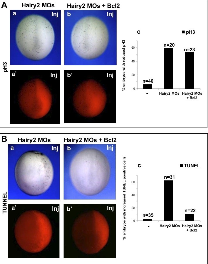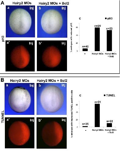 Figure S1. Bcl2 rescues apoptosis but not the reduction of cell proliferation observed in Hairy2 depleted embryos. (A) Phosphohistone H3 immunohistochemistry of neurula embryos injected with Hairy2 MOs (10 ng) with or without Bcl2 mRNA (50 pg) as indicated. The percentage of embryos with reduced pH3 staining observed in each condition is shown in (c). Note the reduction of mitotic cells in the Hairy2 depleted embryos with or without Bcl2 mRNA (-, rhodamine dextran injected alone). Number of embryos examined is indicated. (B) TUNEL staining of neurula embryos injected with Hairy2 MOs (10 ng) with or without Bcl2 mRNA (50 pg) as indicated. The percentage of embryos with increased TUNEL staining is shown in (c). Note the increase of TUNEL staining in Hairy2 depleted embryos and the rescue of the phenotype with Bcl2 mRNA (-, rhodamine dextran injected alone). Number of embryos examined is indicated. In all panels, embryos at neurula stage are shown in dorsal view, anterior down, and the injected side revealed by rhodamine dextran coinjection (red fluorescence) is on the right. |