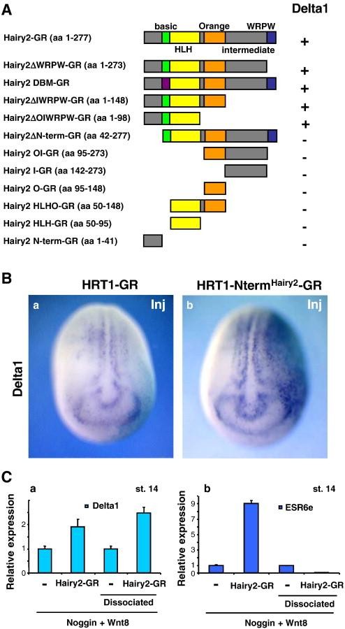 Fig. 3. Identification of Hairy2 domains required for Delta1 induction. (A) Schematic representation of Hairy2-GR wild-type and mutants used. The bHLH, Orange domain and WRPW C-terminal motif are indicated. Embryos injected with 500 pg of mRNA of the indicated inducible constructs were tested at neurula stage by in situ hybridization for Delta1 expression. The activity of the different Hairy2 mutants is indicated (+) for active and (â) for inactive. Note that all mutants containing both the N-terminal portion of the protein and the HLH domain are active. All constructs were tested in a minimum of 20 embryos and the activity described was observed in at least 70% of the embryos. (B) Whole-mount in situ hybridization of neurula embryos injected with 500 pg of HRT1-GR or HRT1-NtermHairy2-GR mRNA and analysed for Delta1 expression. Note that in contrast to wild-type HRT1-GR, HRT1-NtermHairy2-GR induces Delta1. Frequency of embryos: a, none induced, n = 24; b, 85% induced, n = 14. Embryos are viewed from the dorsal side, with the injected side to the right. LacZ mRNA was used as lineage tracer. (C) Q-PCR analysis of Delta1 and ESR6e expression in stage 14 NC induced intact or dissociated animal caps derived from Hairy2-GR mRNA (250 pg/blastomere) injected embryos (â, Hairy2-GR mRNA injected minus DEX). Note that Hairy2-GR activates Delta1 in dissociated NC induced caps (a) and that Esr6e induction, which is observed in intact caps as a consequence of Delta1 induction, is lost in dissociated cells (b), demonstrating the effectiveness of cell dissociation. |