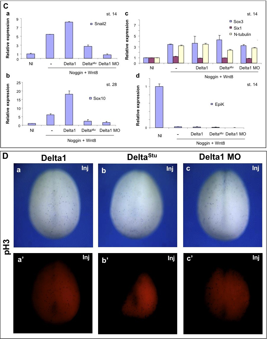 Figure S3. Effect of the modulation of Notch signaling on the development of NC and surrounding tissues.(C) Q-PCR analysis of the expression of Snail2, Sox10, Sox3, Six1 and N-tubulin in NC induced caps analysed at the indicated stages and derived from embryos injected with Delta1 mRNA (500 pg/blastomere), DeltaStu mRNA (1 ng/blastomere) or Delta1 MO (5 ng/blastomere). Note that Delta1 overexpression upregulates Snail2 and Sox10 and that Delta1 inhibition diminished their expression. Note also that the expression of Sox3, Ep keratin, Six1 and N-tubulin was not significantly affected. (D) Phosphohistone H3 immunohistochemistry of neurula embryos injected with Delta1 mRNA (500 pg), Delta1Stu mRNA (1 ng) or Delta1 MO (7,5 ng) (top panels). Note the increase of pH3 staining in Delta1 injected embryos and the reduction of mitotic cells in Delta1Stu mRNA or Delta1 MO injected embryos (a, 38% increased, n = 21; b, 47% decreased, n = 19; c, 43% decreased, n = 21). Embryos are shown in dorsal view, anterior down, and the injected side is oriented to the right. Rhodamine dextran (red fluorescence) was used as a lineage tracer (bottom panels). |