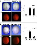 Fig. 4. Hairy2 promotes NC markers and proliferation through Delta1 activation. (A) Q-PCR analysis of Sox10, Snail2 and SoxD expression in NC induced intact or dissociated animal caps derived from Hairy2-GR mRNA (250 pg/blastomere) injected embryos (â, Hairy2-GR mRNA injected minus DEX). Sox10 induction observed upon Hairy2-GR overexpression in intact stage 28 NC induced caps is not observed in dissociated NC induced explants (a). However, repression of Snail2 or induction of SoxD still occurs in dissociated stage 14 NC induced caps (b,c). (B) Whole-mount in situ hybridization of embryos co-injected with Hairy2-GR and Delta1Stu mRNA (1 ng) or Delta1 MO (7.5 ng). Co-injection of Hairy2-GR with Delta1Stu mRNA (1 ng) or Delta1 MO (7.5 ng) affects its ability to induce Sox10 in tailbud embryos, but not its capacity to repress Snail2 or activate SoxD in neurula embryos. Respective repression: (a) 63%, n = 23; (b) 43%, n = 21; (c) 64%, n = 24 and (d) 65%, n = 20. Respective induction: (e) 87%, n = 16 and (f) 60%, n = 28. Lateral views with control and injected sides (a, b, e, f) or dorsal views (c, d) with the injected side on the right are shown. LacZ was used as lineage tracer. (C) Percentage of embryos injected with Hairy2-GR mRNA, Hairy2-GR plus Delta1Stu mRNA (1 ng) or Delta1 MO (7.5 ng) showing increased pH3 staining. Note that co-injection of Delta1Stu mRNA or Delta1 MO blocks Hairy2 ability to promote cell proliferation (â, Hairy2-GR mRNA injected minus DEX). Number of embryos examined is indicated. (D) Percentage of embryos injected as indicated with Bax mRNA (50 pg), Hairy2-GR mRNA (500 pg), Delta1Stu (1 ng) or Delta1 MO (7.5 ng) developing normally or showing a low or high number of dying cells at gastrula stage as shown in Fig. 1C (â, Hairy2-GR mRNA injected minus DEX). Note that Hairy2-GR rescues Bax mRNA mediated embryonic lethality when Notch signaling is blocked. Number of embryos examined is indicated. |