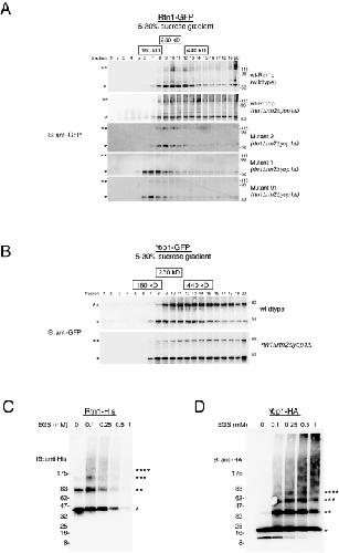 FIGURE 2. Yeast Rtn1p and Yop1p form homo-oligomers in the membrane. A, membranes isolated from wild-type or rtn1Δrtn2Δyop1Δ (NDY257) yeast cells expressing wild-type or mutant forms of Rtn1-GFP at endogenous levels were solubilized in 1% digitonin, fractionated by 5–30% w/v sucrose gradient centrifugation, and analyzed by SDS-PAGE and immunoblotting with anti-GFP antibody. Note that the mutant forms of Rtn1p have peak migrations at a smaller molecular weight than the wild-type protein. B, membranes isolated from wild-type or rtn1Δrtn2Δyop1Δ yeast cells expressing wild-type Yop1-GFP at endogenous levels were solubilized in 1% digitonin and were analyzed as in A. Molecular weight standards in the sucrose gradient are as indicated. C, isolated membranes of yeast cells expressing Rtn1-His were treated with increasing concentrations of EGS and analyzed on SDS-PAGE, and oligomers were visualized by immunoblotting with anti-His antibody. D, membranes of yeast cells expressing Yop1-HA were analyzed as in C and immunoblotted with anti-HA antibody. Asterisks, number of monomeric copies of the specified protein as seen by SDS-PAGE.