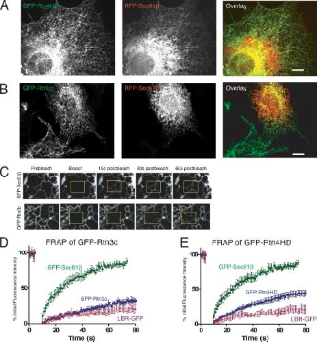 FIGURE 6. The conserved RHD is sufficient for the diffusional immobility of the mammalian reticulons. A and B, exclusive tubular ER localization of GFP-Rtn4HD and GFP-Rtn3c (both in green), two reticulon isoforms containing only the conserved reticulon homology domain, compared with the general membrane protein RFP-Sec61β (red) when expressed in COS-7 cells. C, typical FRAP experiments performed in COS-7 cells comparing the fluorescence recovery of GFP-Rtn3c to GFP-Sec61β illustrates that reticulons containing only the RHD is relatively immobile. Images were taken before and then after the photobleach for the times indicated. The boxed region shows the area that was photobleached. D, quantitation of FRAP analyses of GFP-Rtn3c (blue; n = 6) compared with GFP-Sec61β (green) and LBR-GFP (red), where fluorescence intensities normalized to prebleach values were plotted over time. E, quantitation of FRAP analyses of GFP-Rtn4HD (blue; n = 14), compared with GFP-Sec61β (green) and LBR-GFP (red). All error bars indicate ± S.E.