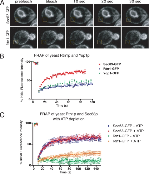 FIGURE 1. Rtn1p and Yop1p have slow diffusional mobility in the ER of yeast cells. A, typical FRAP of Sec63-GFP or Rtn1-GFP in S. cerevisiae cells expressed at endogenous levels. Images were taken before and then after the photobleach for the times indicated. The boxed region shows the area that was photobleached. B, fluorescence intensities normalized to prebleach values of FRAP analyses on yeast Sec63-GFP, Rtn1-GFP, and Yop1-GFP were plotted over time. Error bars indicate ± S.E.; n = 4 cells. C, fluorescence intensities normalized to prebleach values plotted over time of FRAP analyses on yeast Rtn1p in ATP-depleted (green) or non-depleted (orange) cells, compared with that of Sec63p-GFP (ATP depleted in blue; non-depleted in red). Error bars indicate ± S.E., n = 4 cells.