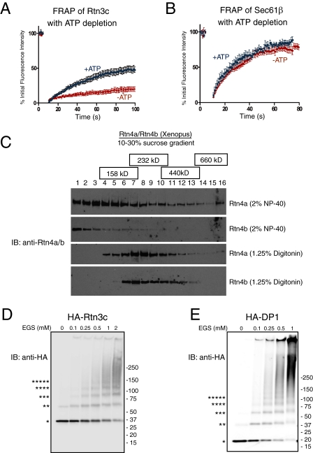 FIGURE 7. The reticulons and DP1 form oligomers in higher eukaryotes. A, quantitated FRAP analyses of mammalian GFP-Rtn3c under ATP-depleted (red, n = 7) or non-depleted (blue, n = 14) conditions. B, mammalian Sec61β-GFP under ATP-depleted (red, n = 9) or non-depleted (blue, n = 6) conditions. FRAP data from ATP-depleted cells were compared with those from non-treated cells from Fig. 6. C, Xenopus membranes solubilized in either 1.25% digitonin or 2% Nonidet P-40 were fractionated by 10â30% w/v sucrose gradient centrifugation, analyzed by SDS-PAGE, and immunoblotted with antibody against Xenopus Rtn4. Molecular weight standards in the sucrose gradient are as indicated. D, isolated membranes of COS-7 cells expressing HA-DP1 or HA-Rtn3c were treated with increasing concentrations of EGS, analyzed on SDS-PAGE, and immunoblotted with anti-HA antibody. Asterisks, number of monomers cross-linked.