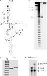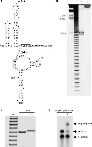Figure 1. A manganese-dependent ribozyme in the 3′-UTR of Vg1 mRNA. (A) The secondary structure of the region encompassing residues 210–350 of the Vg1 localization element (VLE). An arrow indicates the site of cleavage and boxes enclose a consensus polyadenylation signal at position 334 and a nonconsensus signal at 272. The structure was generated using mfold version 3.1 (51). (B) Vg1 RNA (radiolabeled at the 3′-end) was incubated overnight in cleavage buffer in the presence (lane 3) or absence (lane 4) of 10 mM manganese and then analyzed on a denaturing polyacrylamide gel alongside ribonuclease T1 and alkaline hydrolysates (lanes 1 and 2, respectively). The doublet in lane 3 is also apparent in the T1 digest (lane 1) and is due to length heterogeneity in the substrate RNA. (C) A 5′ hydroxyl group at the cleavage site. The 3′ cleavage product was incubated with polynucleotide kinase and ATP and compared to untreated fragment and an alkaline hydrolysate. (D) A 3′ phosphate at the cleavage site. A portion of a cleavage reaction containing an equal mixture of substrate and product RNA was incubated with poly(A) polymerase and compared to an untreated sample. Only the substrate RNA is polyadenylated.