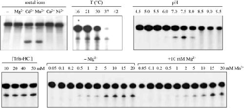 Figure 2. Characterization of the self-cleavage reaction. All reactions were carried out in standard conditions, excepting the indicated variable. The metal dependence of cleavage was tested with the indicated divalent cation at a concentration of 10 mM.