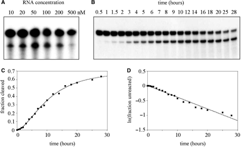 Figure 3. Kinetics of the cleavage reaction. (A) A trace amount of internally labeled Vg1 RNA was added to the indicated concentration of unlabeled Vg1 RNA. The reactions proceeded in standard conditions overnight. (B) Vg1 RNA (100 nM) was incubated for the indicated amount of time in standard conditions. Reactions were stopped with EDTA and analyzed on a denaturing polyacrylamide gel. (C) The autoradiograph was scanned with a laser densitometer to generate the individual data points. The best-fit curve (solid line) is defined by a kinetic equation that represents a two-step process with both steps being first order. (D) The plot of ln(fraction unreacted) versus time yields an observed first-order rate constant of 6.6 × 10−4 min−1.