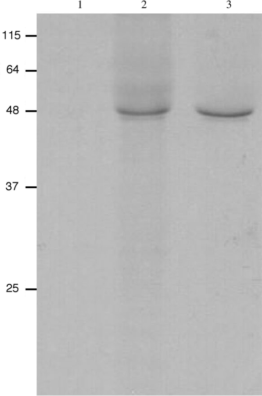 Figure 4. In vivo translation of wild-type and mutant Vg1 mRNA lacking the GAAA ribozyme sequence. Stage VI oocytes were injected with capped mRNA and incubated overnight in OR2 buffer containing [35S]methionine/cysteine. Vg1 protein was immunoprecipitated from whole-cell extract prepared from 20 oocytes and analyzed by SDS–PAGE followed by autoradiography. Lane 1, oocytes injected with water only; lane 2, oocytes injected with wild-type mRNA; lane 3, oocytes injected with mRNA in which the GAAA ribozyme sequence was changed to CCCA.