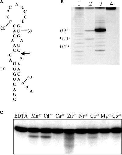 Figure 5. A manganese-dependent ribozyme in the zipcode of β-actin mRNA. (A) The predicted secondary structure of the zipcode element in the 3′-UTR of β-actin mRNA (52). An arrow marks the site of manganese-dependent cleavage. (B) Zipcode RNA (radiolabeled at the 3′-end) was incubated overnight in cleavage buffer in the presence (lane 3) or absence (lane 4) of 10 mM manganese and then analyzed on a denaturing polyacrylamide gel alongside alkaline and ribonuclease T1 hydrolysates (lanes 1 and 2, respectively). (C) The metal dependence of self-cleavage in zipcode RNA. RNA was incubated overnight in the presence of the indicated metal. Weak cleavage with Cu2+ has been reported previously for the manganese ribozyme (53); whereas, Zn2+ triggers nonspecific degradation.
