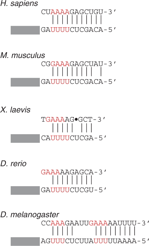 Figure 7. Predicted base-pairing interactions between the HDE of histone mRNAs and U7 snRNAs. Selected histone mRNAs (top strand) and U7 snRNAs (bottom strand) are presented; only the region immediately flanking the Sm site (designated by a rectangle) of U7 is shown in each case. Adapted from ref. 41.