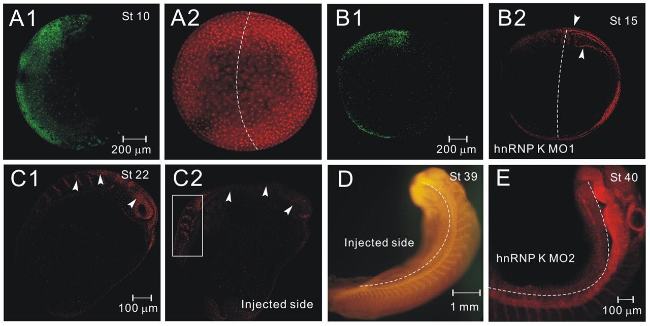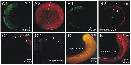 Fig. 3. Suppression of hnRNP K expression by antisense MO. Embryos were unilaterally injected with two separate non-overlapping hnRNP K MOs (MO1 in A-D; MO2 in E). (A1,A2) Stage 10 gastrula; persistent maternal hnRNP K expression. (B1,B2) Stage 15 neural plate stage; suppression of hnRNP K expression on the injected side (left of broken line). Upper arrowhead, neural fold; lower arrowhead, somitic mesoderm, on the uninjected side. (C1,C2) Stage 22 tailbud stage; hnRNP K expression in myotome, spinal cord and brain (arrowheads, left to right, respectively) was suppressed on the injected side (C2) when compared with the uninjected side (C1). Because the animals are bent, the optical section in C2 also contained some cells from the uninjected side of the embryo (rectangle). (D,E) Three-day tadpole (stages 39 and 40); the uninjected side exhibited normal staining and morphology, but the injected side exhibited only background immunostaining and some defects in somites. (A1-C2,E) Confocal optical sections; (D) fluorescence dissecting microscopic view of whole animal. hnRNP K immunostaining, red; co-injected FITC-dextran, green. |