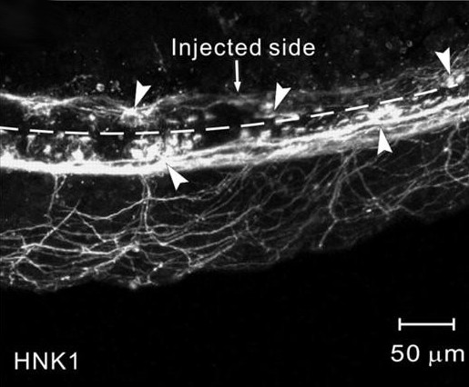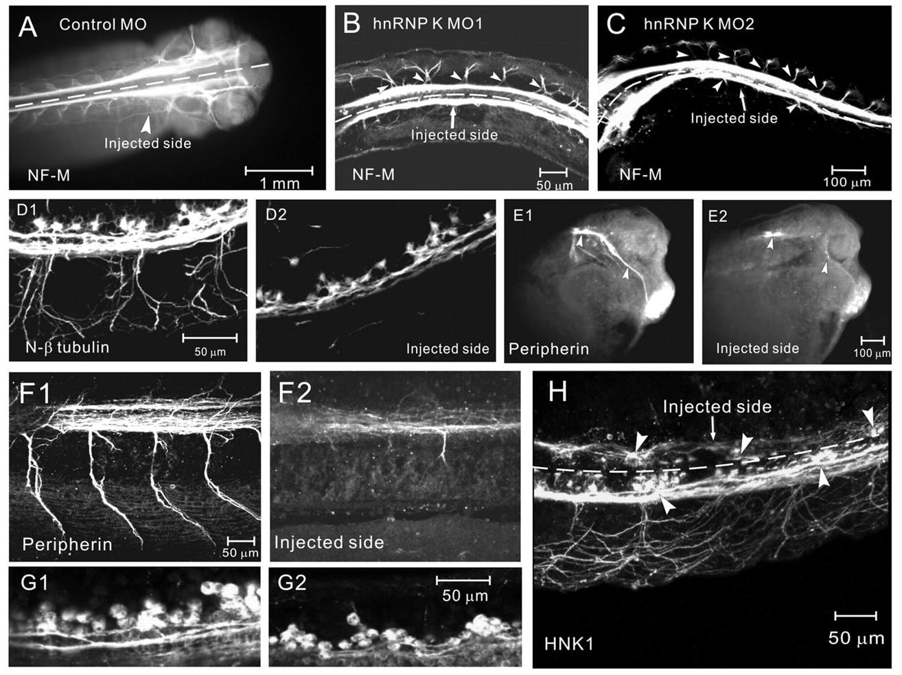 Fig. 4. Suppression of axonal outgrowth by hnRNP K MO in intact animals. Embryos unilaterally injected with control MO (A), hnRNP K MO1 (B,D-H) or hnRNP K MO2 (C) processed at stage 37/38 by whole-mount immunofluorescence. (A-C) Embryos injected with control MO (A), hnRNP K MO1 (B) or MO2 (C), and immunostained for NF-M. Broken lines separate injected (lower) from uninjected (upper) sides. (B,C) Arrowheads on the injected side indicate peripheral motor axons; arrowheads on the uninjected side indicate residual wispy peripheral axons. (A) View under the fluorescence dissecting microscope; (B,C) stacked confocal optical sections. (D1) Neuronal β-tubulin staining in neuronal perikarya and peripheral axons of spinal cord, uninjected side. (D2) Tubulin staining in perikarya and a few scattered fibers, injected side. (E1-G2) Peripherin immunostaining of head (E1,E2) and spinal cord (F1,F2,G1,G2). (E1,F1,G1) Uninjected side; (E2,F2,G2) injected side. (E1,E2) Trigeminal ganglion neuronal perikarya (upper arrowhead) and nerves (lower arrowhead). (F1,F2) Spinal cord with peripheral motor axons. (G1,G2) Spinal cord neuronal perikarya. (H) Spinal cord immunostained for HNK-1. Robust staining of neuronal perikarya and axons on the uninjected side (below the broken line); clusters of stained neuronal perikarya (arrowheads) and very few fibers on the injected side (above the broken line). Scale bars in D1,E2,F1 and G2 also apply to D2,E1,F2 and G1, respectively. |