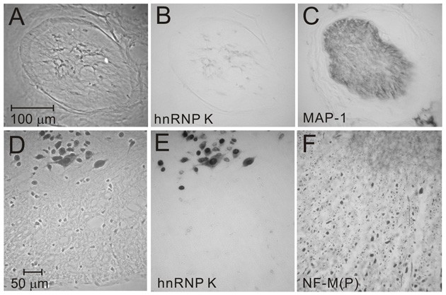 Fig. S1. Absence of hnRNP K from axons. (A-F) Transverse sections of optic nerve (A-C) and ventral spinal cord (D-F). Sections were stained by immunoperoxidase with diaminobenzidine/nickel chloride. Phase-contrast (A,D) and bright-field (B,E) views of sections stained for hnRNP K. Comparable sections are stained for MAP-1 (C) and a phosphorylated epitope of NF-M (F) to label axons. Ventral motoneurons are at the top of D-F. Scale bars: in A, 100 for A-C; in D, 50 for D-F, respectively. |
