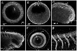 Fig. 1. Expression of hnRNP K in whole-mount embryos. (A) Stage 10 gastrula; hnRNP K was found in all germ layers, but was most intense in mesectoderm (M). yp, yolk plug. (B) Stage 15 neural plate; hnRNP K staining intensified in mesectoderm. NF, neural plate and adjacent neural folds; NC, notochord; SM, somitic mesoderm. (C-F) Stage 22 tailbud (C), stage 37/38 tadpole (D), stage 42 tadpole (E,F). hnRNP K was abundant in brain and spinal cord (SC), in aligned nuclei of somitic muscle (unlabeled arrowheads) and all retinal layers by stage 42 (E). OV, optic vesicle; RGC, retinal ganglion cell layer; IN, interneuron layer; PR, photoreceptor layer; CF, choroidal fissure. NC, notochord. Scale bars: in A, 100 μm for A-D; 50μ m in E,F. |