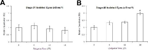 Figure 8. Isolated eyes show rhythmic expression of xBmal1 at stage 40 but not at stage 31.Eyes were dissected from embryos maintained in a 12L:12D cycle at different stages of development and different circadian times (ZT 0 (dawn), ZT6 (mid-day), ZT12 (dusk),and ZT18 (midnight)). The eyes were analyzed by qRT-PCR. The relative quantitation (RQ) of xBmal1 for each sample was calculated with respect to EF1α. No difference in the levels of xBmal1 expression was observed in stage 31 embryonic eyes at any time of day tested (ANOVA; df3, F = 1.77, p = 0.176; arrhythmic). A significant difference in xBmal1 expression was observed when all ZTs were analyzed in stage 40 embryonic eyes (ANOVA; df3, F12.23, p = 0.00009). The asterisk shows that the level of xBmal1 expression at ZT18 was significantly different from ZT0 (ANOVA, df1, F = 27.82, p = 0.0004). Bars in each graph denote standard error. |
