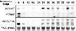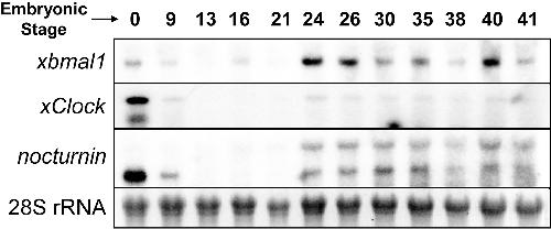 Shown are northern blots performed on RNA isolated from whole embryos at the indicated stages in 12L:12D cycle. Three micrograms of total RNA was loaded into each lane. 28S RNA was used as a loading control. |