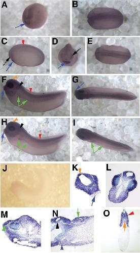 Shown are in situ hybridization results depicting expression of xBmal1 mRNA. All embryos are oriented with the anterior to the left in all panels except A and D. Panel A shows the embryo from the anterior, but slightly angled to one side. D shows an anterior view. Panels C, F, H and J show side views of the embryos. Panels B, E G, and I show dorsal views of the embryos. Panels K and O show transverse sections and panel N shows a sagittal section of late tailbud embryos. Panel A and B depict a stage 18 embryo with xBmal1 staining in the neural plate and cement gland (blue arrow). C show stage 23 (neural tube stage) embryos with expression in the eye (black arrow), cement gland (blue arrow), and somites (red arrowhead). F show early (F) and late (H) tailbud stages where xBmal1 is expressed in the eye, pineal (orange arrowhead), otic vesicle (black arrowhead), somites (red arrowhead) and the pronephric tubules and duct (green arrows). Cement gland staining was lost (blue arrow). K and L show expression in the brain, retina/lens, pineal (orange arrowhead), and absence of staining in the cement gland (blue arrow). M show expression in the olfactory pit (green arrowhead), otic vesicle (black arrowhead), pronephric tubules (green arrow), heart (blue arrowhead), somites (red arrowhead), and notochord (orange arrow). No expression was seen using a sense probe specific to xBmal1 (J). |