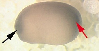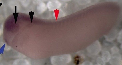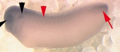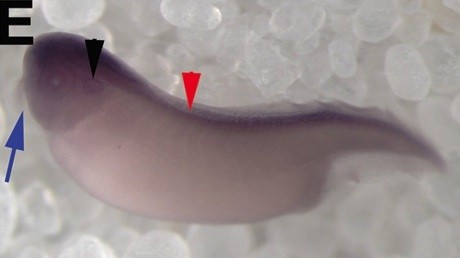 per 1 (period circadian clock 1) gene expression in Xenopus laevis embryo, assayed via in situ hybridization, NF stage 22, lateral view, anterior left, dorsal up.