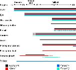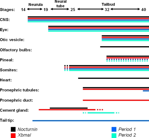 Figure 7. A temporal summary of the expression patterns of xPer1, xPer2, xBmal1, and Nocturnin.The approximate stages of development are represented on the horizontal axis of this figure while the particular tissues and organs are listed on the vertical axis. xPer1 is represented by the blue lines, xPer2 by the green lines, xBmal1 by the red lines, and Nocturnin by the black lines. Dotted lines indicate times during development when a gene may be present, but was not confirmed through sectioning or additional whole mount in situ analysis. |