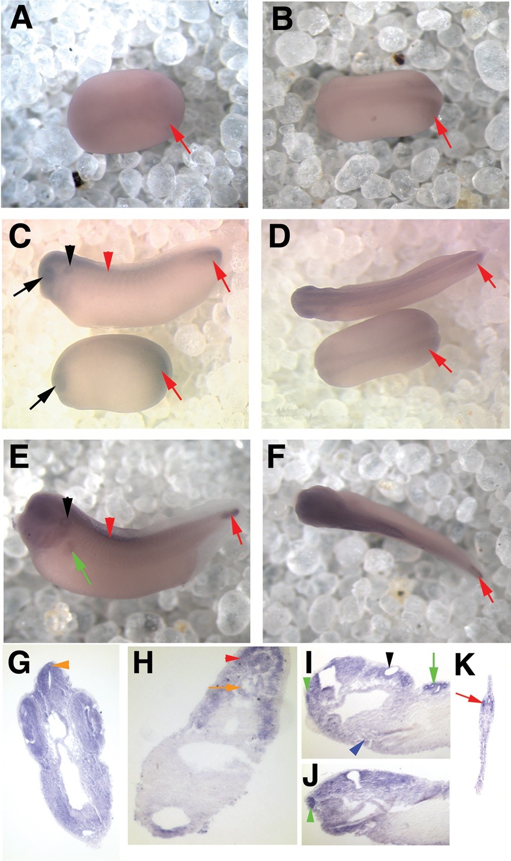 Shown are in situ hybridization results depicting expression of xPer1 mRNA. Panels A, B, D, and F show dorsal views of the embryos and panels C and E show side views of the embryos. All whole mount embryos (as well as panel I) are oriented with the anterior facing left. Dorsal is toward the top in all images. A and B show neural plate staining at stage 15/16 and stage 18, respectively. Red arrows denote posterior mesoderm staining (A). C and D show a neural tube stage embryo on the bottom (stage 22) and an early tailbud stage embryo on top (stage 33). The black arrow denotes eye expression and the red arrowhead shows somite staining. C and D also show xPer1 expression in the CNS and posterior mesoderm (red arrow), as well as the otic vesicle (C, black arrowhead). Panels E and F depict xPer1 expression in the CNS, somites (red arrowhead), otic vesicle (black arrowhead), pronephric tubules (green arrow) and posterior mesoderm (red arrow) in a late tailbud stage embryo. Panels G show sections of late tailbud embryos (G and J are transverse sections and I is a sagittal section). G shows expression in the neural tube, retina, lens, and pineal gland (orange arrowhead). H shows expression in the notochord (orange arrow) and the somites (red arrowhead). In panel I, the olfactory pit (green arrowhead), otic vesicle (black arrowhead), heart (blue arrowhead) and pronephros (green arrow) were stained. Panel J shows olfactory pit staining (green arrowhead). Panel K shows posterior mesoderm staining in the tail tip (red arrowhead).