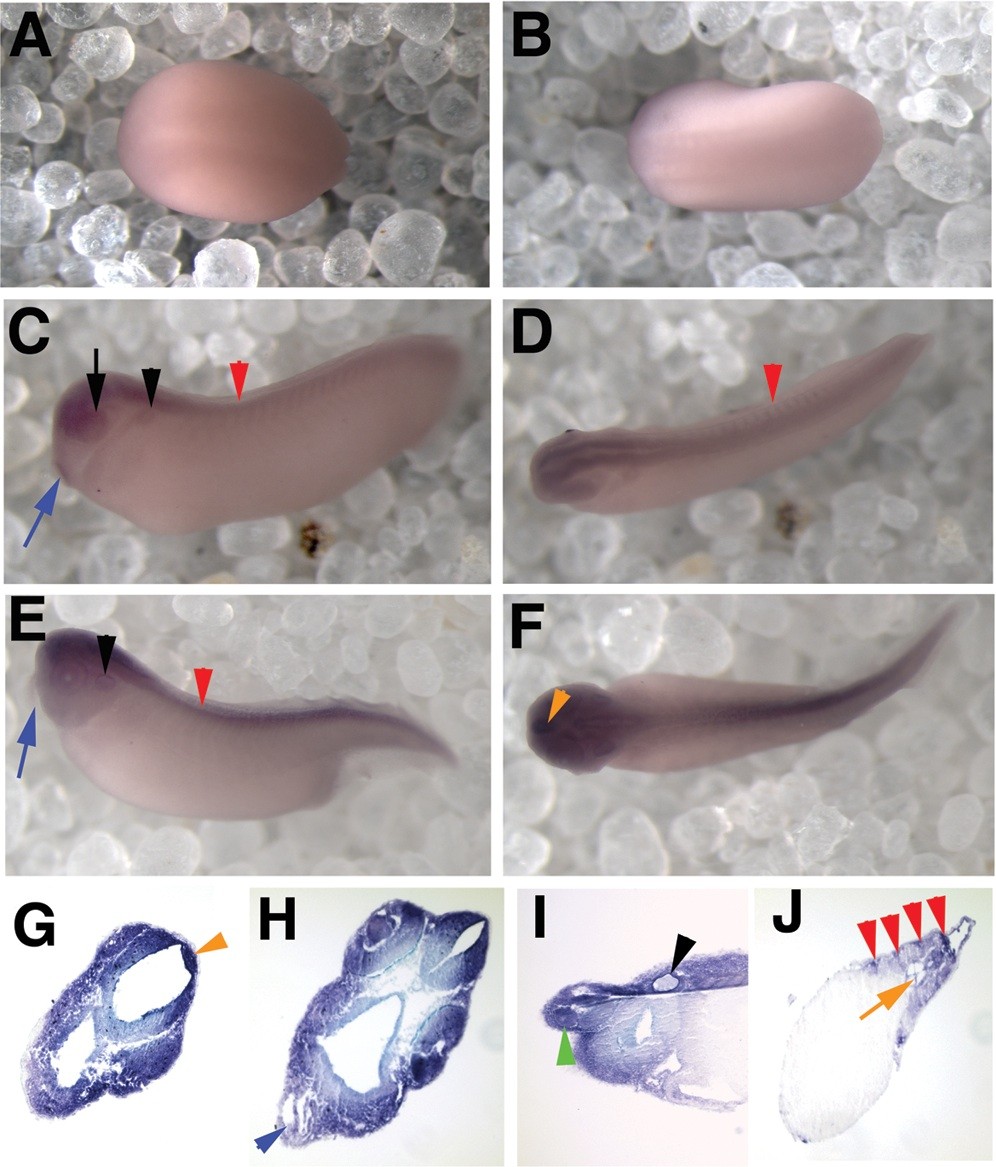 Shown are in situ hybridization results depicting expression of xPer2 mRNA. Panels A, B, D, and F show a dorsal view of each embryo. Panels C and E show side views. All embryos are oriented with the anterior to the left. G show transverse sections and J shows a sagittal section of late tailbud stage embryos. Sections shown in G, H, and J are oriented with the dorsal side at the top right of the panel. Neural plate staining is shown in panel A (stage 16) and B (stage 18). C and D depict early tailbud embryos with continued expression in the CNS as well as in the eye (black arrow), otic vesicle (black arrowhead), cement gland (blue arrow) and somites (red arrowheads). In late tailbud embryos (E and F), xPer2 is expressed in the otic vesicle (E,I, black arrowhead), pineal (F,G, orange arrowhead), brain, retina, lens (G), and olfactory pit (I, green arrowhead), although cement gland staining was lost (E, blue arrow). xPer2 was also present at low levels in the heart (H, blue arrowhead) and notochord (J, orange arrow). J also shows somite staining (red arrowheads). |