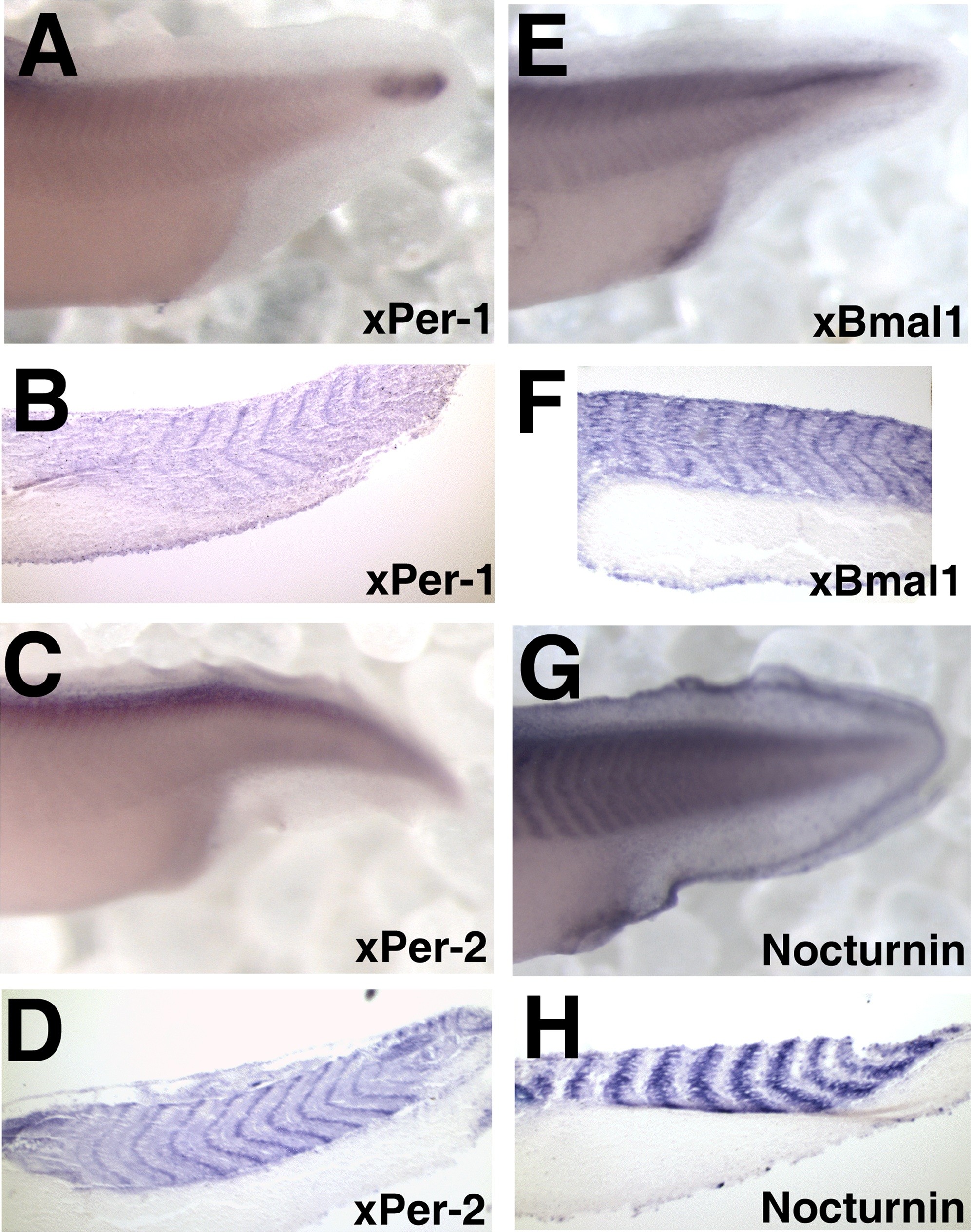 Shown are in situ hybridization results depicting RNA expression in paired whole mount and sagittal sections of the posterior of embryos stained with xPer1 (A), xPer2 (C), xBmal1 (E), and Nocturnin (G). |
