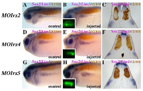 Fig. S3. Irx2, Irx4 and Irx5 are not required for kidney formation. All embryos were injected with specific Irx MOs and GFP mRNA in V2.2 blastomere of 8- to 16-cell stage embryos. Stage 22 embryos injected and triple labelled for Sox2 and Lim1 in purple and 12/101 in brown. (A,D,G) Control uninjected sides. (B,E,H) Morpholino-injected sides. Insets show the GFP distribution in the injected embryos. Impairment of Irx2, Irx4 or Irx5 does not affect Lim1 expression. Transverse sections of injected embryos are shown in C,F,I. |
