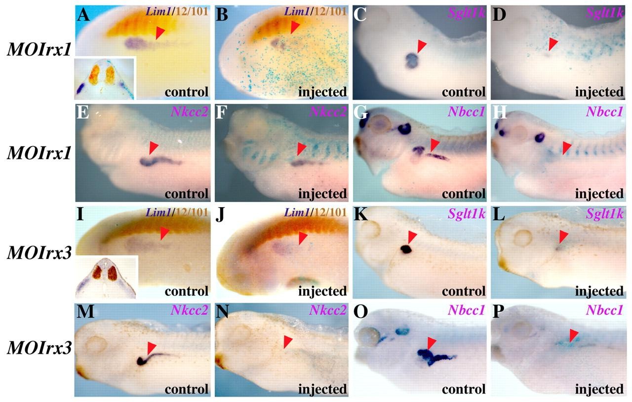 Fig. 2. Irx1 and Irx3 are necessary for kidney formation in Xenopus. Embryos are shown in lateral views; red arrowheads indicate the kidney territory. Embryos were injected in a single blastomere (V2.2) at the 8- to 16-cell stage and lacZ mRNA was used as linear tracer. Control and injected sides of the same embryo are shown, respectively, of the same specimen. The gene examined in each condition is indicated in the right upper corner of the panels in all figures. (A-H) Embryos injected with MOIrx1 showed reduced Lim1 expression at late neurula (A,B) and downregulation of Sglt1k (C,D), Nkcc2 (E,F) and Nbcc1 (G,H) expression at tadpole stages. Inset in (A) indicates a transverse section of the embryo shown in the major panel. (I-P) Similar results were found upon MOIrx3 injection. |
