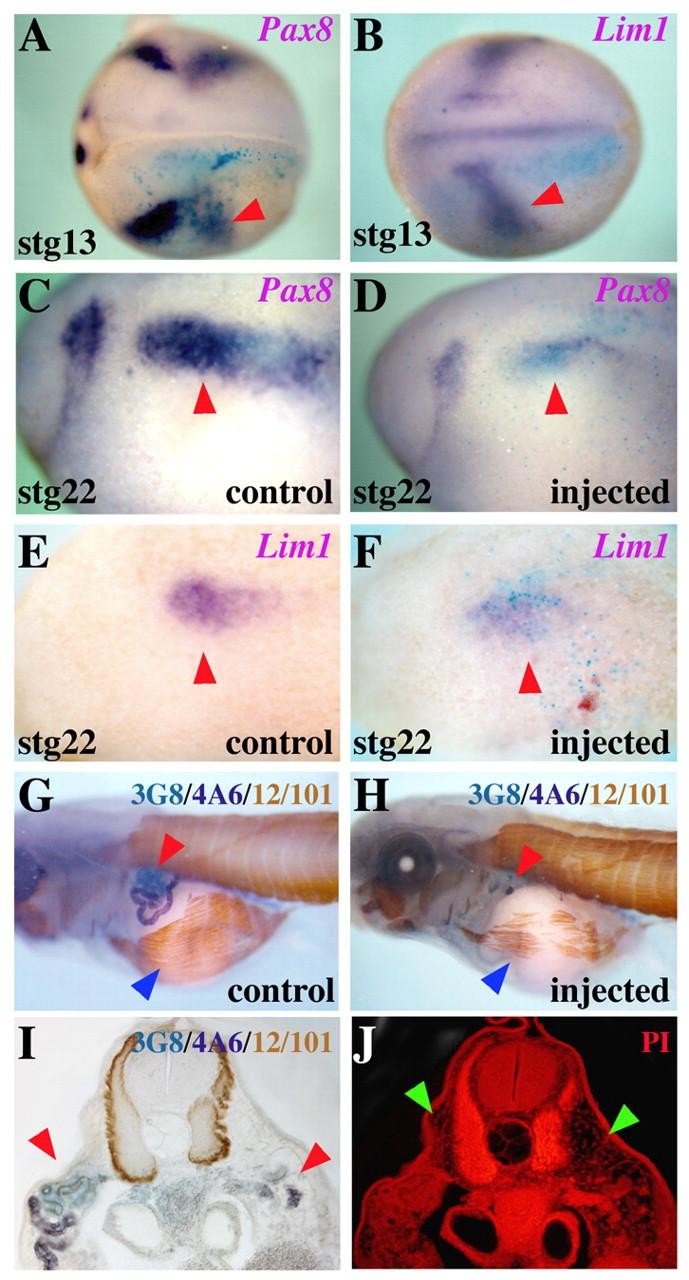 Fig. 3. Irx genes are not required for the initial activation of the early kidney genes. Embryos are shown in lateral views (except A and B, which are dorsal views); red arrowheads indicate the kidney territory. Embryos were injected in a single blastomere (V2.2) at the 8- to 16-cell stage. Xenopus embryos injected with a mix of Irx1 and Irx3 MOs and lacZ mRNA were assayed for the expression of Pax8 and Lim1 genes at early (A,B) or late (C-F) neurula stages. (A,B) Impairment of Irx gene function does not affect early expression of Pax8 (A) or Lim1 (B). (C-F) By contrast, depletion of Irx activity downregulates the expression of these genes at late neurula stage. (G,H) Tadpole embryos injected with Irx1 and Irx3 MOs and triple labelled for muscle (12/101, brown), pronephric tubules (3G8, blue) and duct (4A6, purple). The injected side (H) shows strong impairment of kidney tissue (red arrowheads) and reduced number of ventral muscle fibres (blue arrowheads) when compared with the control side (G). (I) Transverse section of the embryo shown in H. (J) The same section after treatment with propidium iodide. An increased number of fibroblast-like cells in the injected right side compared with the control left side (arrowheads). |