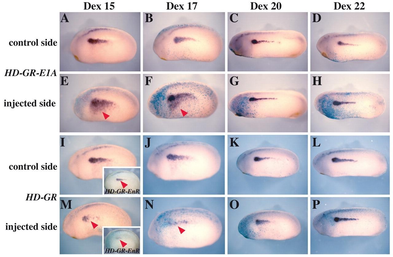 Fig. 5. Early Irx gene requirement for pronephros development occurs at neurula stages. Embryos are shown in lateral views. Embryos were injected in a single blastomere (V2.2) at the 8- to 16-cell stage and lacZ mRNA was used as linear tracer. Late neurula-early tailbud Xenopus embryos co-injected with 500 pg of HD-E1A-GR (A-H), HD-GR (I-P) or HD-EnR-GR (I,M, inset) mRNAs and assayed for expression of Lim1. (A-H) Embryos injected with a hormone-inducible activating form of Irx (HD-E1A-GR) show expanded Lim1 only when Dex was added during mid neurula stages (arrowheads). (I-P) Embryos injected with a hormone-inducible dominant negative (HD-GR) form of Irx show reduced Lim1 expression only when Dex was added during mid neurula stages (arrowheads). The same results were found with a hormone-inducible repressing form of Irx (HD-EnR-GR) (I and M, inset and not shown). |
