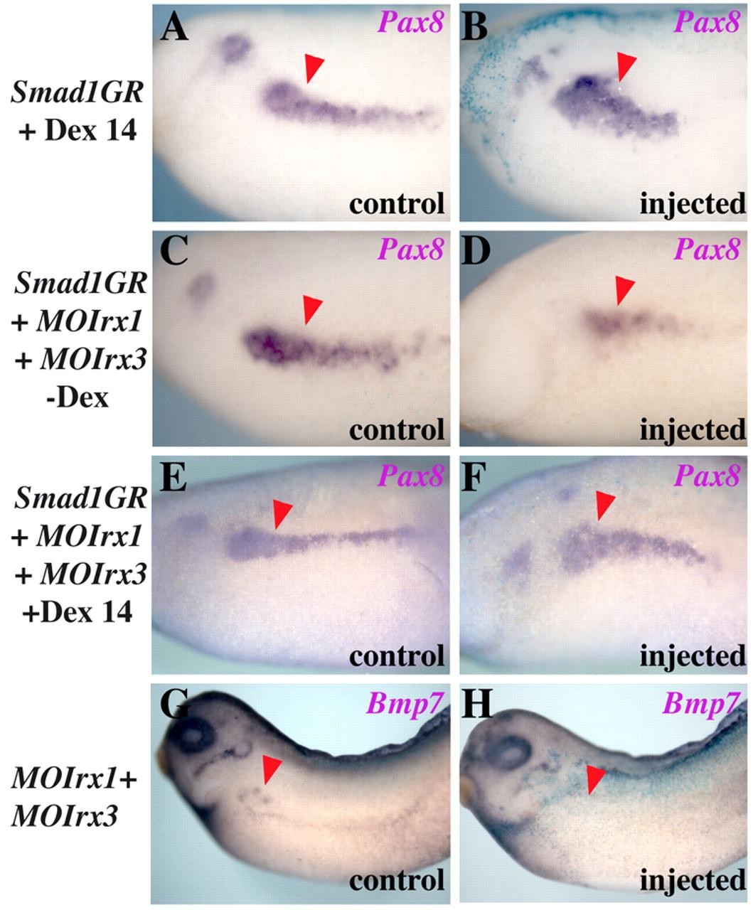 Fig. 6. Irx gene loss of function kidney defects are partially rescued by increased Smad1 activity in Xenopus. Embryos are shown in lateral views and red arrowheads indicate the kidney territory. Embryos were injected in a single blastomere (V2.2) at the 8- to 16-cell stage and lacZ mRNA was used as linear tracer. (A,B) Injection of 500 pg of Smad1GR mRNA, upon addition of dexamethasone (Dex) at stage 14, expanded Pax8 expression. No effect was observed in the absence of hormone (not shown). (C-F) In embryos co-injected with 500 pg of Smad1GR mRNA and 4 ng of each Irx1 and Irx3 MOs Pax8 expression was downregulated (C,D) or rescued (E,F) in the absence or presence of Dex, respectively. (G,H) Depletion of Irx1 and Irx3 impaired Bmp7 expression. |