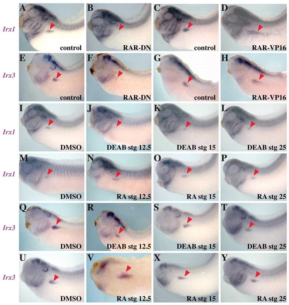 Fig. 9. Irx1 and Irx3 are positively regulated by retinoic acid signalling. Embryos are shown in lateral views and red arrowheads indicate the kidney territory. Embryos were injected in a single blastomere (V2.2) at the 8- to 16-cell stage and lacZ mRNA was used as linear tracer. All panels show Xenopus tadpole embryos. (A,B,E,F) Embryos injected with a dominant negative RA receptor mRNA (RAR-DN) showed impaired Irx1 (A,B) and Irx3 (E,F) expression. (C,D,G,H). Embryos injected with a constitutive RA receptor mRNA (RAR-VP16) showed a strong expansion of Irx1 (C,D) and Irx3 (G,H) expression. (I-Y) Embryos treated at different developmental stages (as indicated) with DMSO (I,M,Q,U), with the inhibitor of RA signalling pathway DEAB (J-L,R-T) or with RA (N-P,V-Y), and analyzed for Irx1 (I-P) or Irx3 (Q-Y) expression. Both genes negatively or positively responded to DEAB (J,R) or RA (N,V), respectively, only when the drugs were added at stage 12.5. |