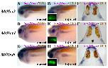 Fig. S4. Transplanted Irx morphant tissue showed impaired pronephros, but not muscle or neural tissue, development. The same embryo, stained for markers for pronephros (Lim1, purple), neural tissue (Sox2, blue) and somatic muscles (12/101, brown) is shown in all panels. (A) Control side showed normal Lim1 expression (arrowhead). (B) The transplanted Irx1 and Irx3 morphant tissue, outlined in red, showed reduced Lim1 expression (arrowhead). No effect was observed in muscles or neuroectoderm. (C) GFP localization on the side containing the transplanted tissue. (D) Overlay of B and C showing the extent of the transplanted area. Inset in D shows a transversal section of this embryo. Lim1 (arrowhead), but not Sox2 or 12/101, levels are reduced in the transplanted side. |
