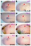 Fig. 8. Temporal requirement for Irx function during proximal-distal pronephric patterning. Embryos are shown in lateral views and red arrowheads indicate the kidney territory. Embryos were injected in a single blastomere (V2.2) at the 8- to 16-cell stage and lacZ mRNA was used as linear tracer. (A-H) Xenopus embryos injected with HD-GR mRNA. (A-D) Impairment of Irx activity during neurula stages downregulated Sglt1k, Gata3 (A,B) and Nkcc2 (C,D) expression. (E-H) Impairment of Irx activity during tailbud stages did not affect Sglt1k or Gata3 (E,F) but reduced Nkcc2 (G,H) expression. (I-P) Embryos injected with MT-Irx1-GR mRNA. (I-L) Increasing Irx1 function during neurula caused ectopic, patched Sglt1k (I,J) and enlarged Nkcc2 expression domains (K,L). No effect was observed on the duct marker Gata3 (I,J). (M-P) Increasing Irx1 function during tailbud did not affect Sglt1k or Gata3 (M,N) but enlarged Nkcc2 (O,P) expression. (Q-X) Similar results were found in embryos injected with MT-Irx3-GR mRNA. |