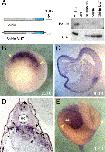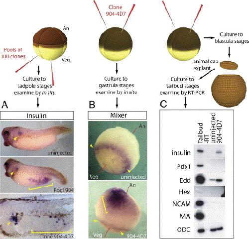 Fig. 1. Expression cloning of novel inducers of pancreatic fate. (A) Pools of 100 RNAs from a gastrula-stage cDNA library were injected into vegetal blastomeres of eight-cell stage Xenopus embryos. Tadpole stage embryos were hybridized to an antisense insulin probe. Whole-mount in situ hybridization using antisense insulin probe, top to bottom: uninjected embryo; embryo injected with 1 ng of 904 pool RNA; vibratome section of embryo injected with the single clone 904-4 D7 RNA. Arrowheads indicate endogenous insulin staining; brackets indicate ectopic insulin expression. An indicates animal pole; Veg indicates vegetal pole. (B) Gastrula stage embryo injected animally with 904-4 D7 and hybridized to an antisense mixer probe. Arrowheads indicate endogenous mixer staining; bracket indicates ectopic mixer expression in the ectoderm. An indicates animal pole; Veg indicates vegetal pole. (C) RT-PCR analysis of animal caps injected with 1 ng 904-4 D7 RNA and cultured until stage 32 (tailbud). Muscle Actin (MA) was used as marker of mesodermal cells at tailbud stage. ODC was used as a loading control for RT-PCR. |