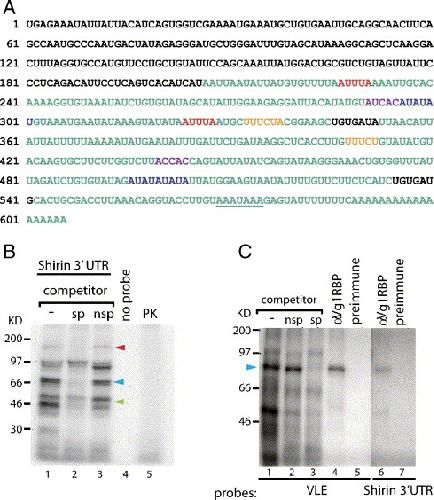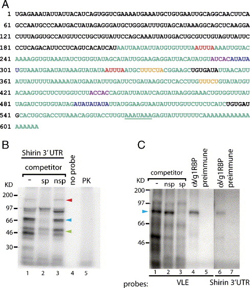 Fig. 3. Analysis of the Shirin 3â²UTR sequence. (A) Nucleotide sequence of the entire 3â²UTR of Shirin. The last 400 nt corresponding to the clone 904-4 D7 (referred to as Shirin 3â²UTR) are in green in the figure. Predicted sequence features present in Shirin 3â²UTR: two potential ARE motifs (red in the figure); two EDEN motifs (blue in the figure); two K-box sequence motifs (black in the figure); two Vg1 motif 1 (VM1; orange in the figure); and two E2 motifs (purple in the figure). Underlined sequence indicates the polyA signal. (B) UV cross-linking assay using 32P-Shirin 3â²UTR RNA as probe and Xenopus embryo extracts at tadpole stage. In the absence of competitor RNA (lane 1). Competitions were carried out with 100-fold excess of either specific competitor (sp, unlabeled Shirin 3â²UTR; lane 2) or non-specific competitor (nsp, polylinker of MT-pCS2+; lane 3). As control, the reaction was performed in the absence of probe (lane 4). Proteinase K digestion of the complexes indicated that the binding factors were proteins (lane 5). Colored arrowheads indicate three major cross-linked proteic complexes. (C) UV cross-linking and immunoprecipitation assay. As positive control, 32P-VLE (for Vg1 Localization Element) was used as probe (lanes 1â5), and for the immunoprecipitation assay, the anti-Vg1RBP antibody and rabbit pre-immune serum, as negative control; 32P-Shirin 3â²UTR RNA as probe (lanes 6â7), and for the immunoprecipitation assay, the anti-Vg1RBP antibody and rabbit pre-immune serum, as negative control. Competitions were carried out with 100-fold excess of either non-specific competitor (nsp, polylinker of MT-pCS2+) or specific competitor (sp, unlabeled specific RNA probes). Vg1RBP is indicated by the blue arrowhead. |