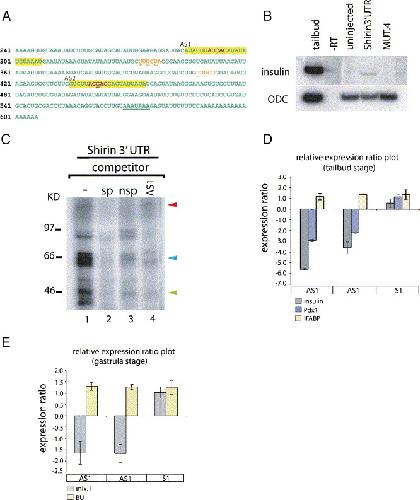 Fig. 4. Disruption of the Shirin 3â²UTR and Vg1RBP RNAâprotein interaction results in loss of Shirin insulin-inducing activity. (A) Nucleotide sequence of Shirin 3â²UTR from nt 241 to nt 606, showing two VM1 (orange in the figure) and two E2 motifs (purple in the figure). Underlined sequences indicate single nucleotide substitutions within the VM1 (UâG) and E2 (CâG) motifs. Sequences highlighted in yellow correspond to the sequences targeted by the 2â²-O-Me antisense oligoribonucleotides (AS1 and AS2). Sense oligoribonucleotides were used as control. (B) Mutational analysis of Vg1RBP-binding motifs in the Shirin 3â²UTR sequence. Animal caps injected with 1 ng of wild-type Shirin 3â²UTR and mutated Shirin 3â²UTR, bearing point mutations in all the four Vg1RBP-binding sites (indicated as MUT. 4), at the two-cell stage and analyzed for the expression of insulin by RT-PCR at stage 32 (tailbud). (C) UV cross-linking assay using 32P-Shirin 3â²UTR RNA as probe and Xenopus embryo extracts at tadpole stage. In the absence of competitor RNA (lane 1). Competitions were carried out with 100-fold excess of specific competitor (sp, unlabeled Shirin 3â²UTR; lane 2), non-specific competitor (nsp, polylinker of MT-pCS2+; lane 3), 10 μM AS1 (lane 4). Colored arrowheads indicate three major cross-linked proteic complexes. (D) Real-time RT-PCR analysis of Xenopus embryos injected with 2â²-O-Me antisense oligoribonucleotides. Two-cell stage embryos injected with 10 μM oligoribonucleotides (AS1 and S1) into the vegetal pole were analyzed for the expression of insulin, Pdx1, and IFABP by quantitative real-time RT-PCR at stage 32 (tailbud). The plot shows the regulation (expression ratio) of the target genes in injected embryos versus uninjected embryos (the control group). All the values were normalized to the reference gene, ODC, and calculated using the software REST© (Relative Expression Software Tool) (Pfaffl et al., 2002). In embryos injected with sense oligoribonucleotide sequence (S1), the expression of insulin and Pdx1 was unaffected. The experiment was repeated three times, and each time, two embryos for each condition (AS1-injected, S1-injected, uninjected) were examined. Data were determined in triplets. Similar observations were made also with the oligoribonucleotides AS2 and S2 (data not shown). (E) Real-time RT-PCR analysis of Xenopus embryos injected with 2â²-O-Me antisense oligoribonucleotides. Two-cell stage embryos injected with 10 μM oligoribonucleotides (AS1 and S1) into the vegetal pole were analyzed for the expression of mix.1 and BU by quantitative real-time RT-PCR at gastrula stage. |